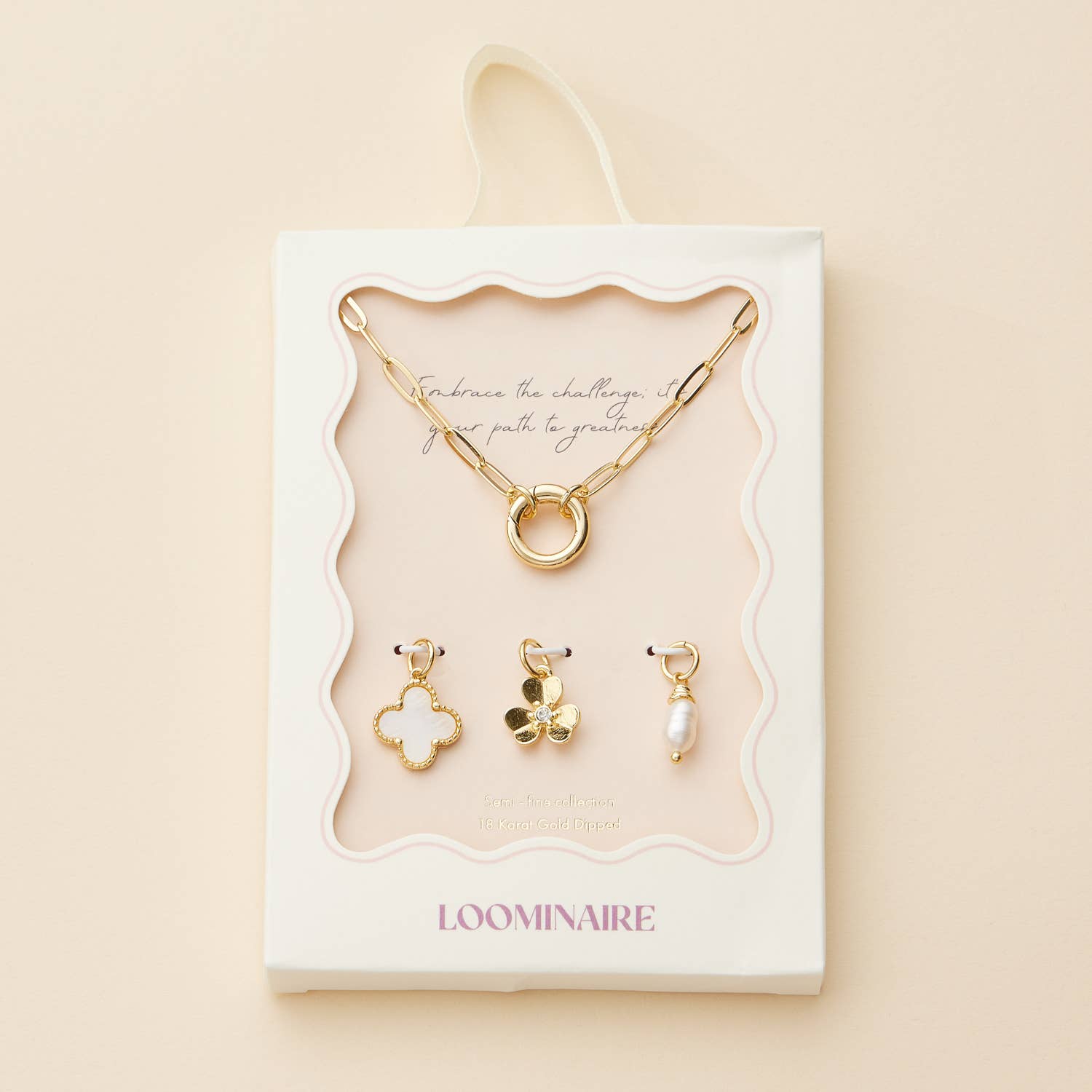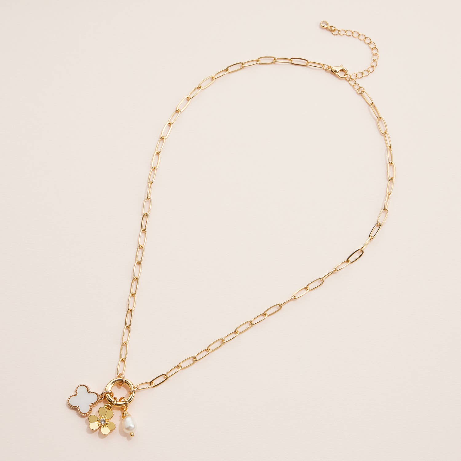 This elegant 18 karot gold dipped necklace features a trio of delicate charms: a mother-of-pearl clover, a sparkling flower pendant, and a timeless pearl drop. The modern chain with oversized links adds a contemporary touch to this classic design, making it versatile enough for any occasion. Whether you're dressing up or down, this necklace offers a stylish combination of sophistication and charm. With an adjustable length and secure clasp, it's perfect for layering or wearing on its own as a statement piece. Length - 16" + 3 " ext Material - Brass, Gold Dipped Charm Size - Approx. 1-1.5cm