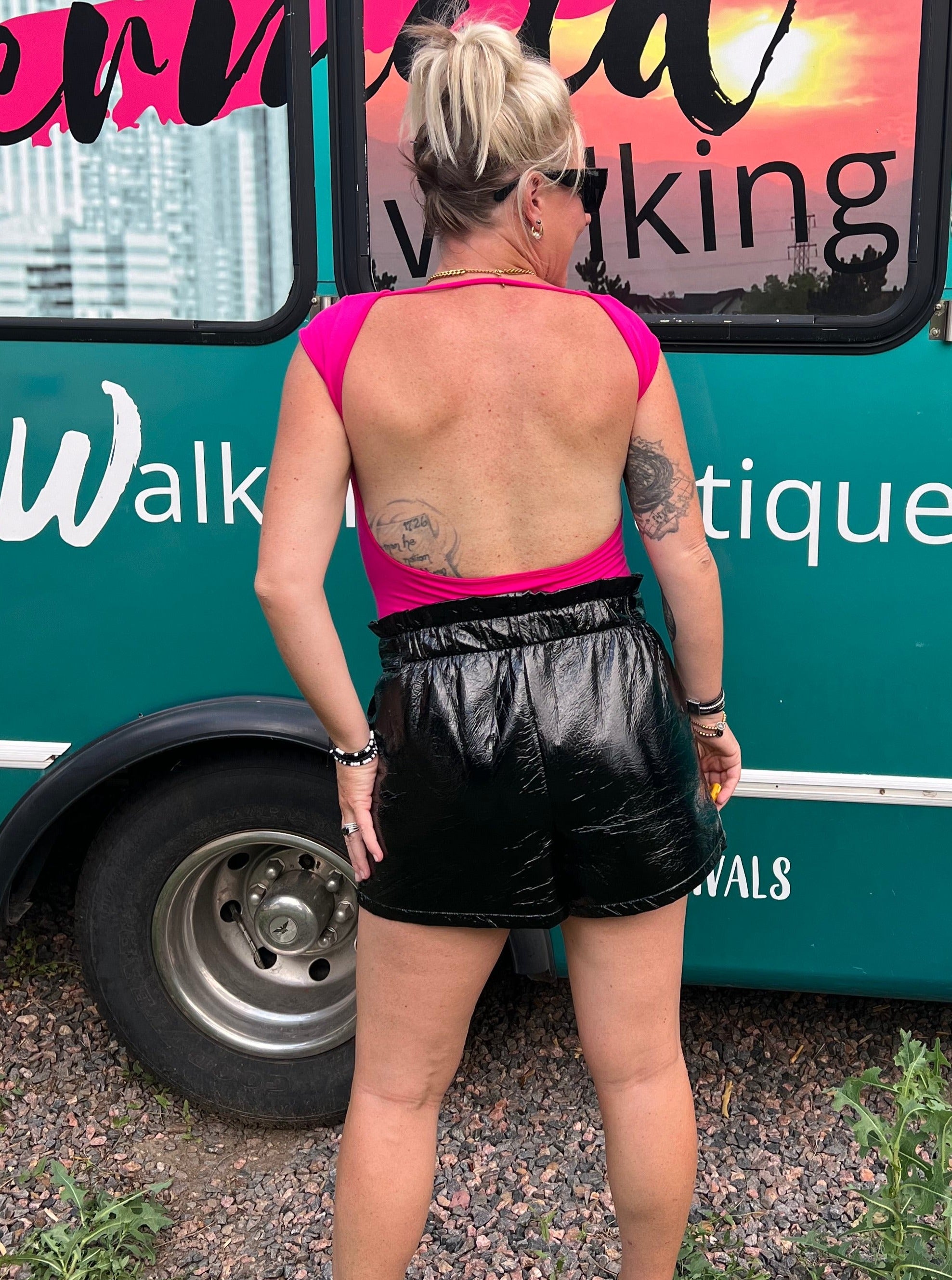 • Stunning open back that stays secure.