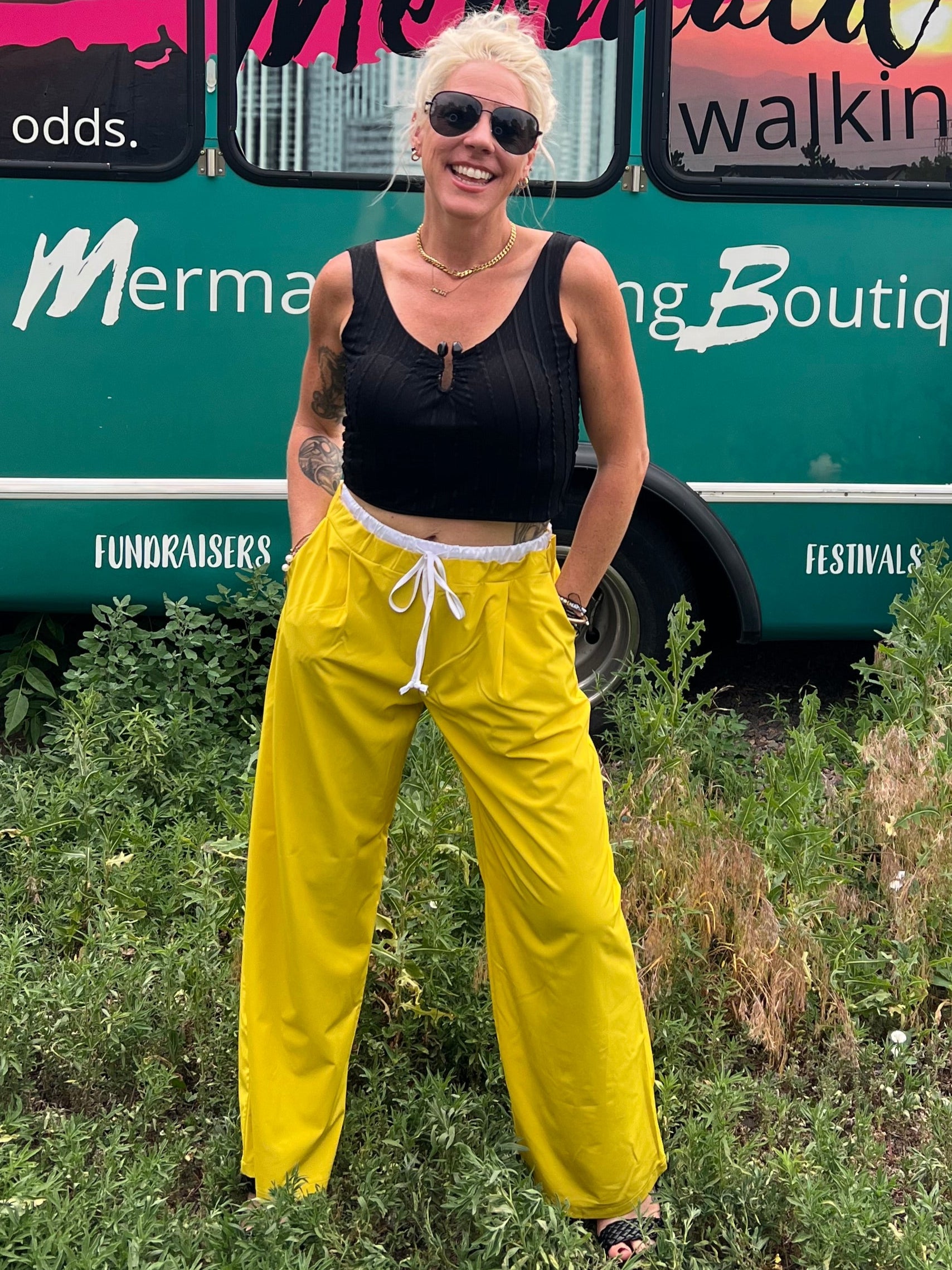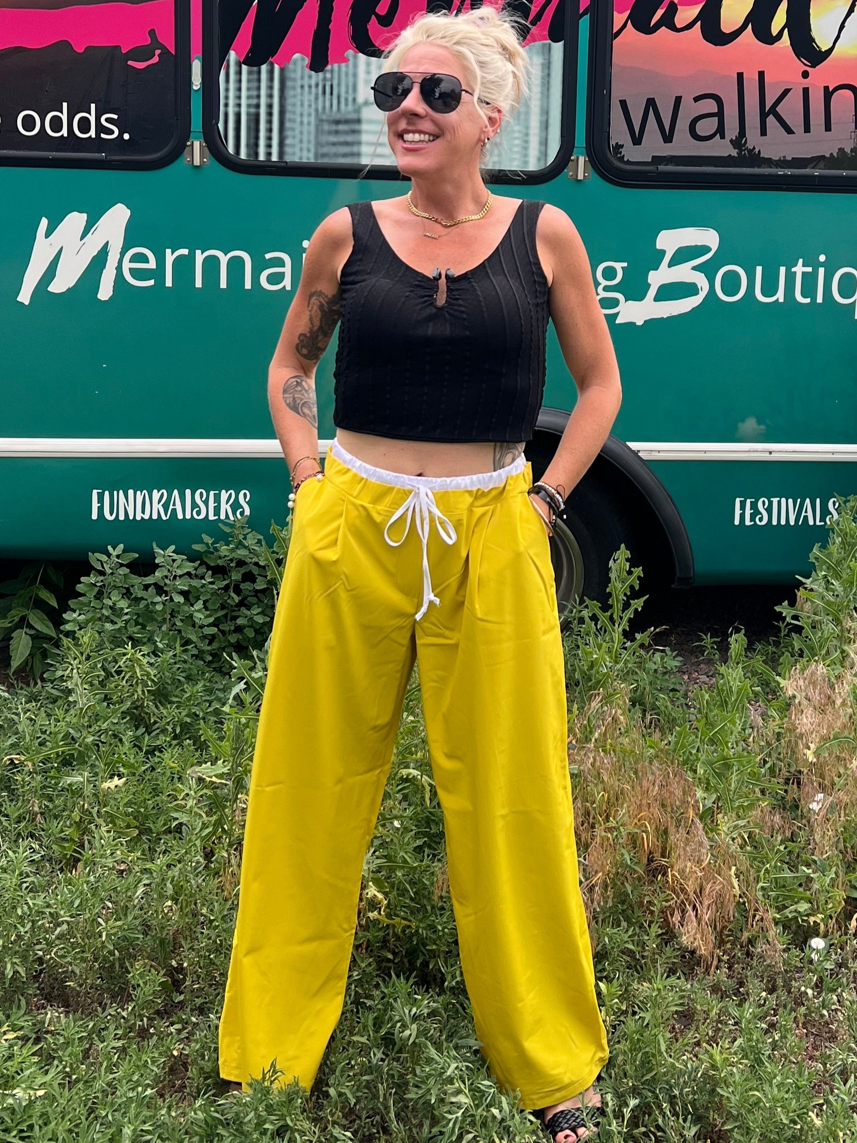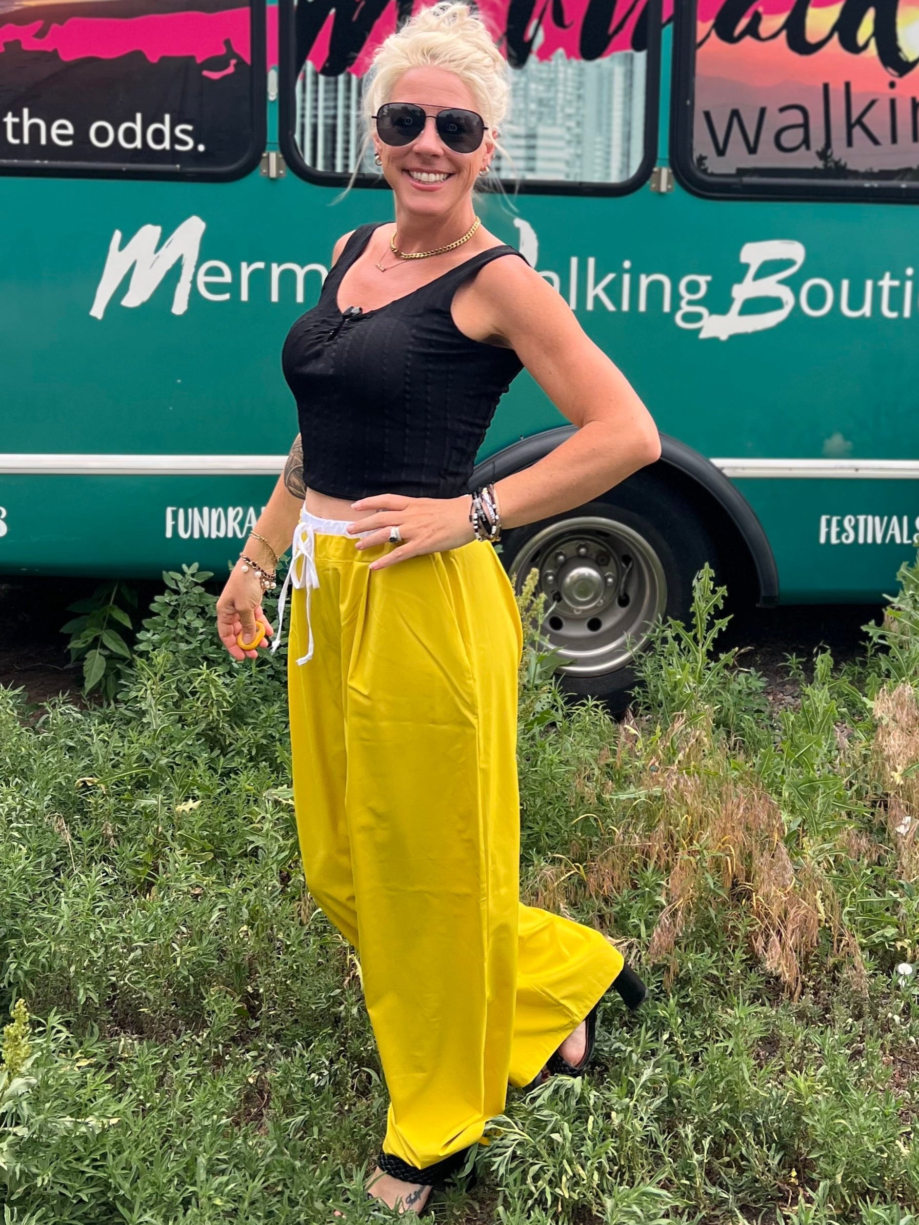 Woman in yellow pants and black top standing in front of a mobile boutique bus.