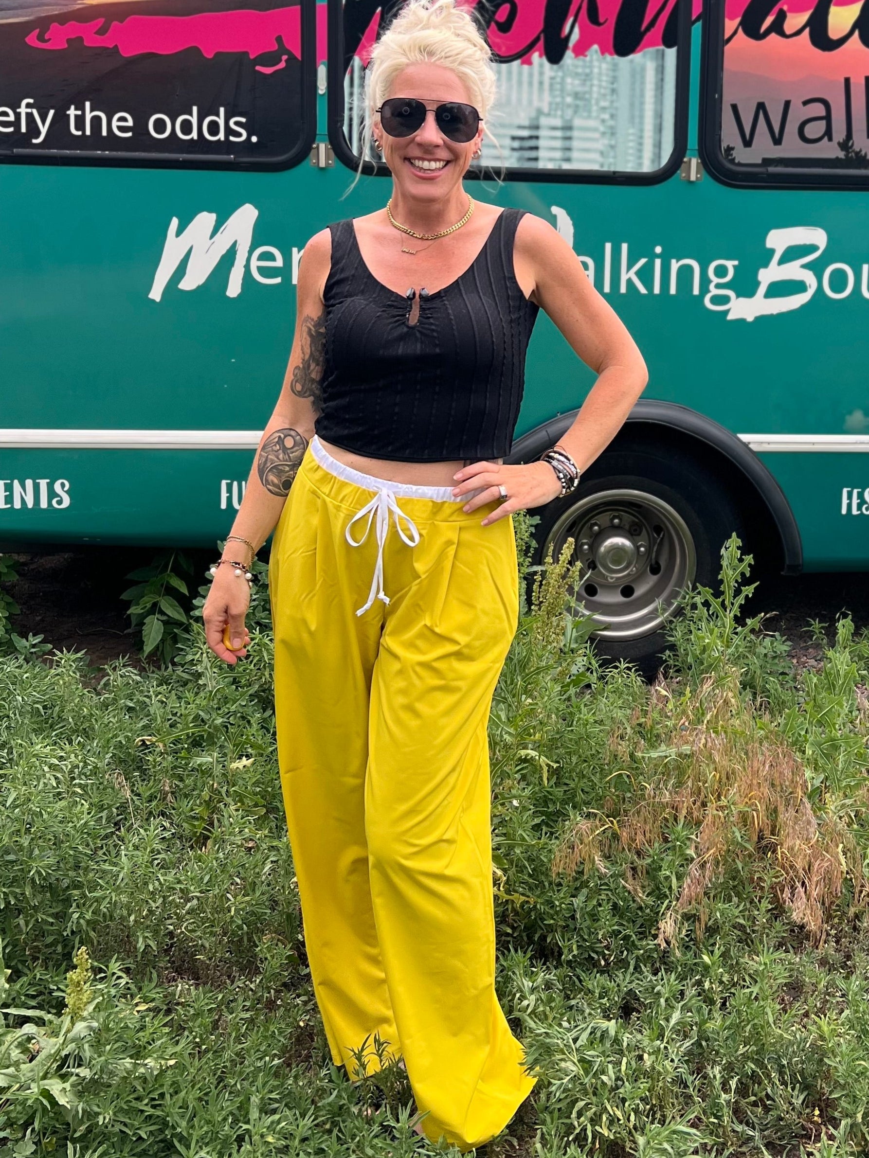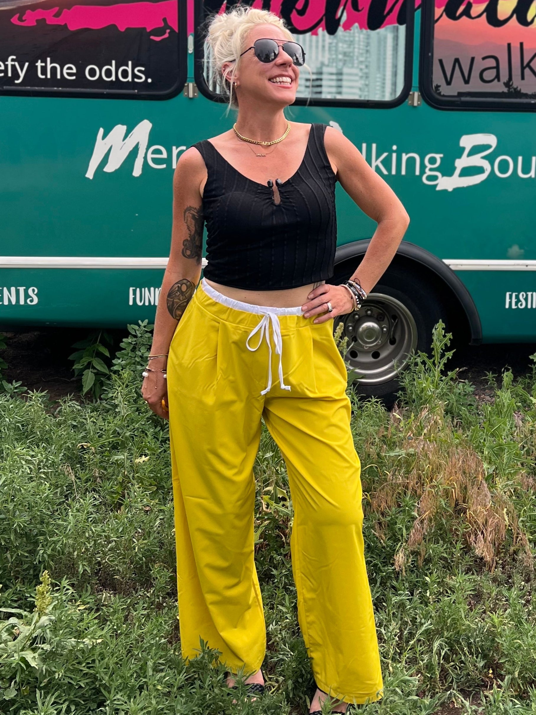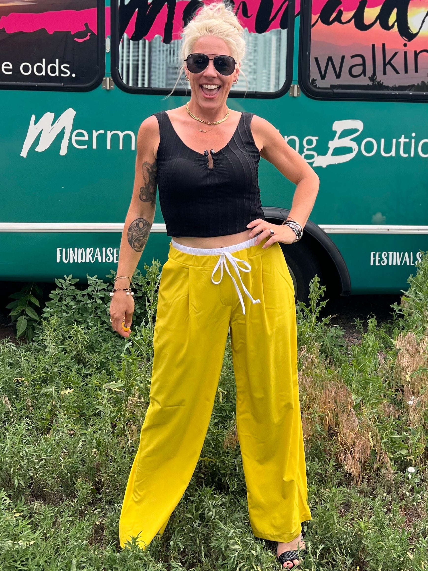 Woman in yellow pants and black top standing in front of a mobile boutique bus.