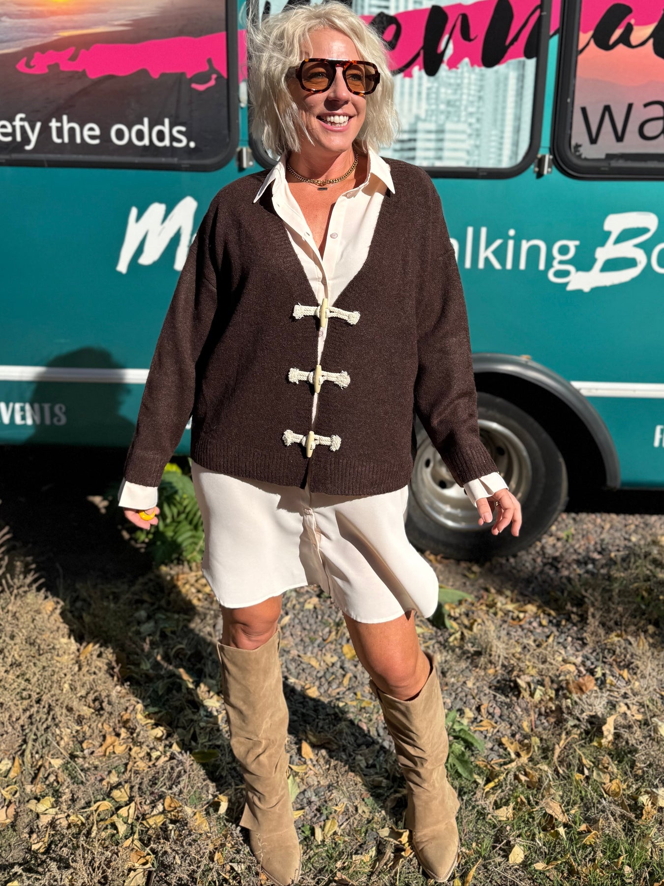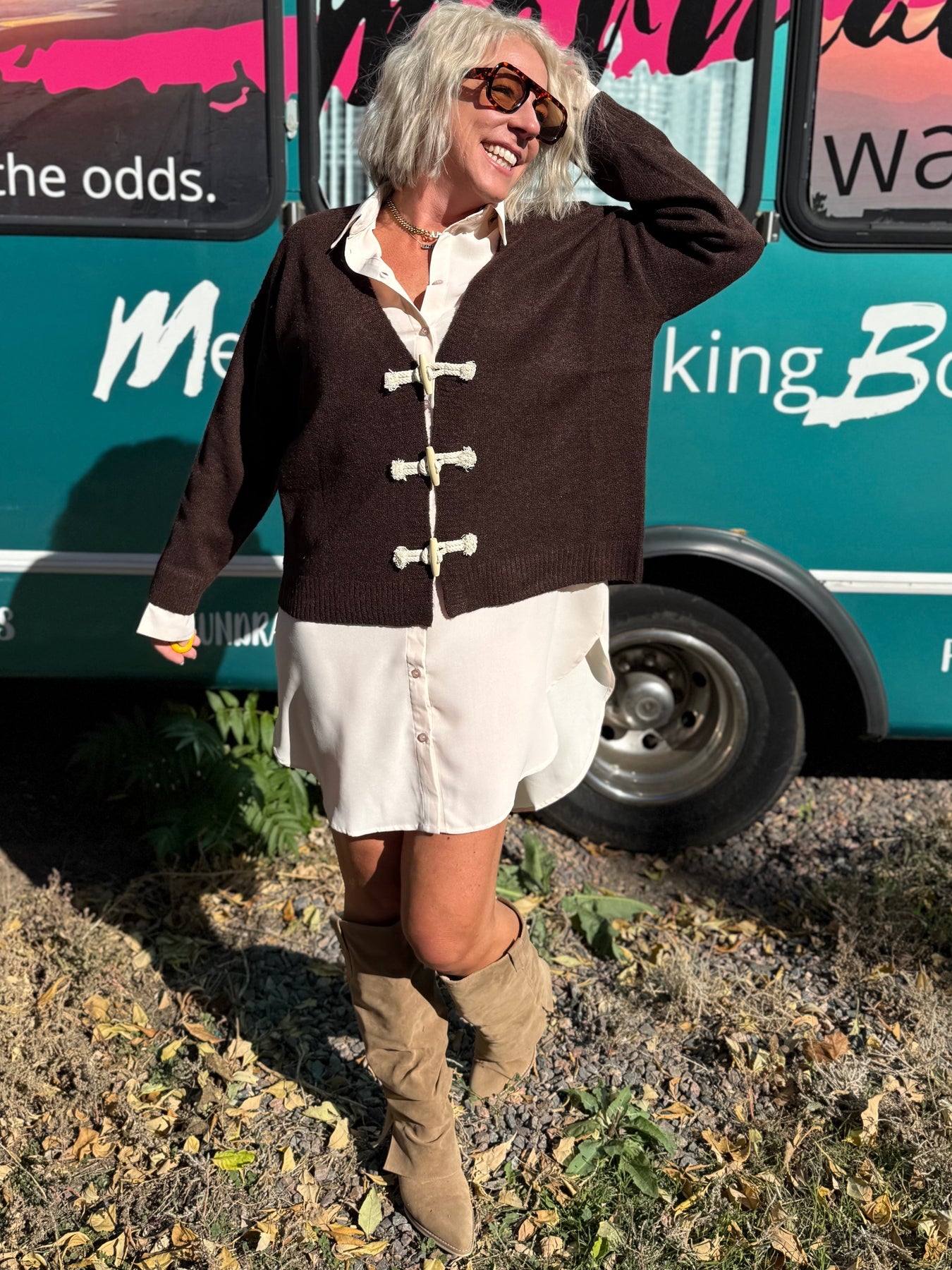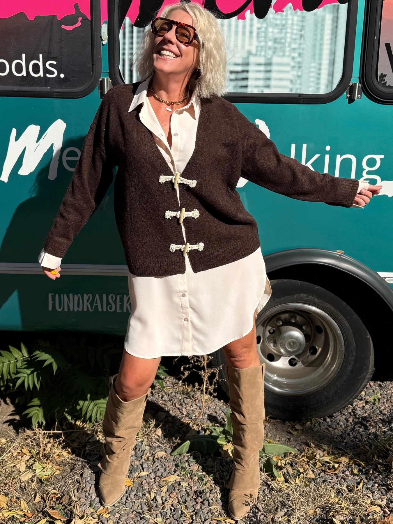 The Katalina Cardigan is proof that cozy doesn’t mean boring. Part of the Ascend Collection, this rich chocolate knit brings bold texture and laid-back power to your next-level wardrobe. With its statement toggle closures and perfectly slouchy silhouette, it’s the kind of piece that makes you look like you have your life together — even when you’re running five minutes late and thriving on caffeine.