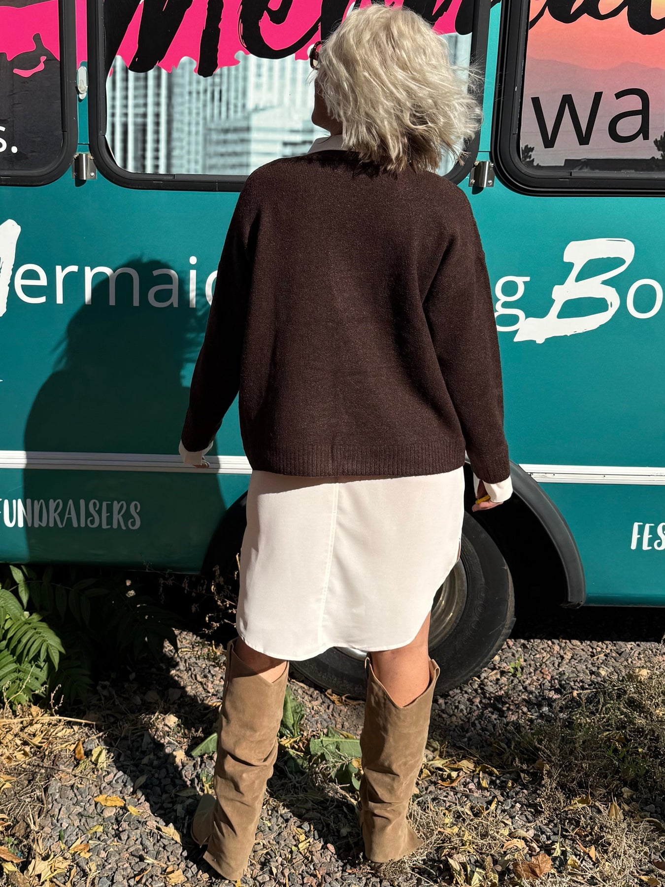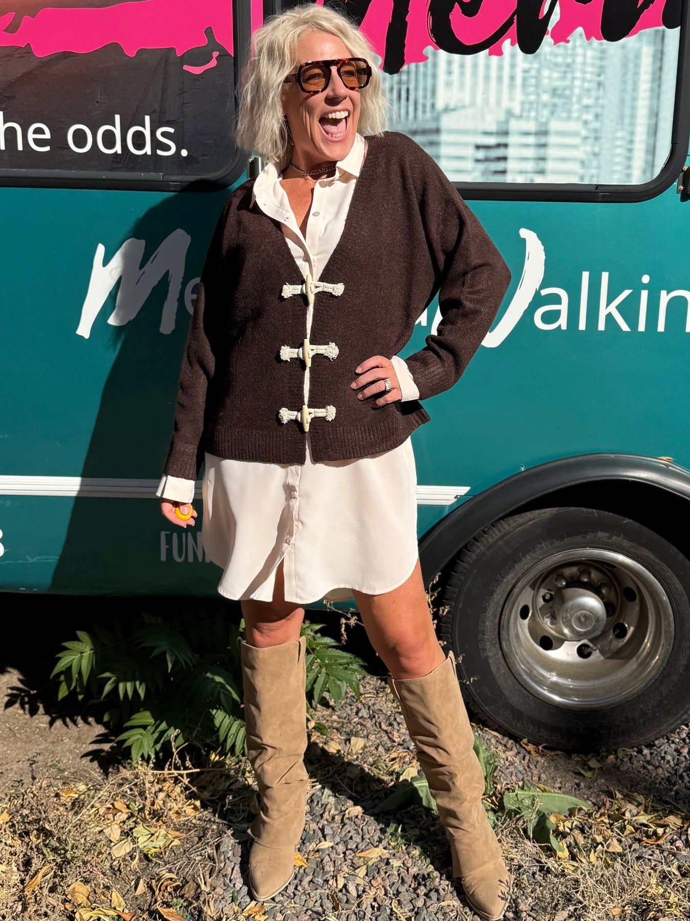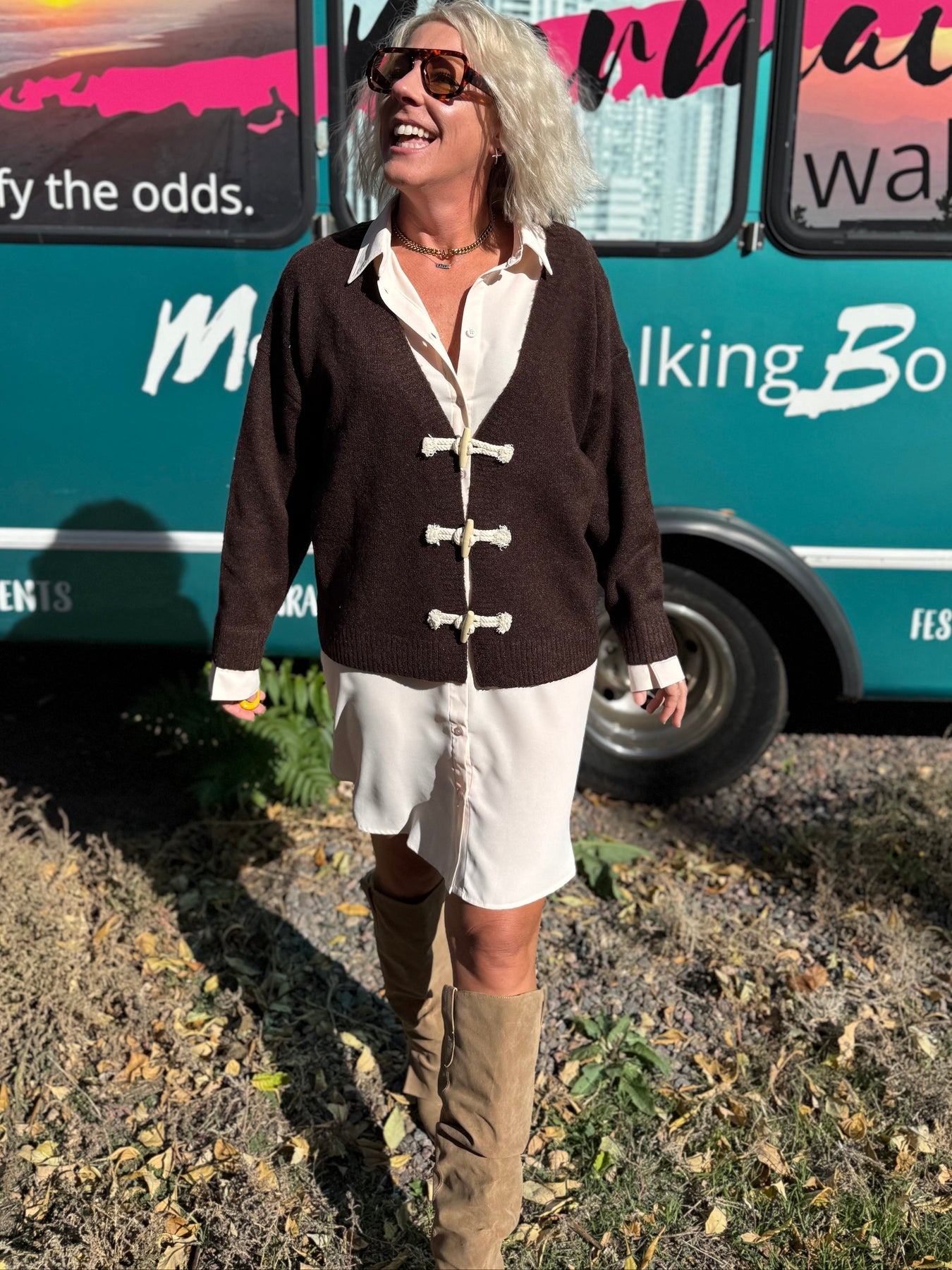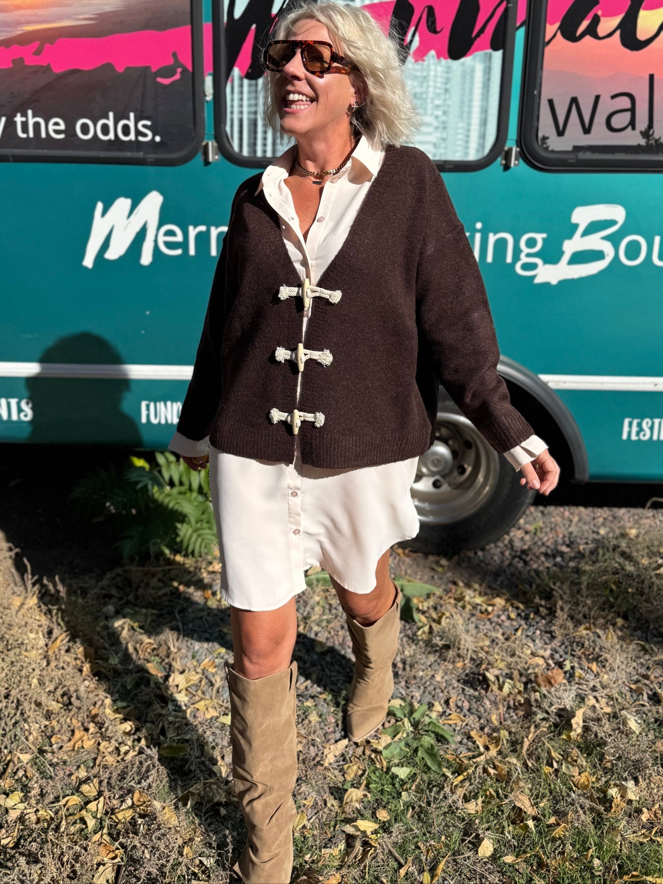 The Katalina Cardigan is proof that cozy doesn’t mean boring. Part of the Ascend Collection, this rich chocolate knit brings bold texture and laid-back power to your next-level wardrobe. With its statement toggle closures and perfectly slouchy silhouette, it’s the kind of piece that makes you look like you have your life together — even when you’re running five minutes late and thriving on caffeine.