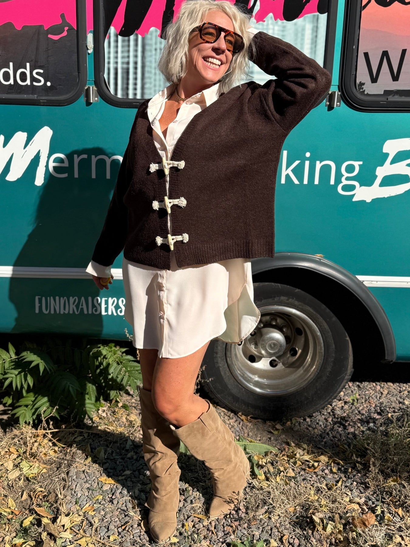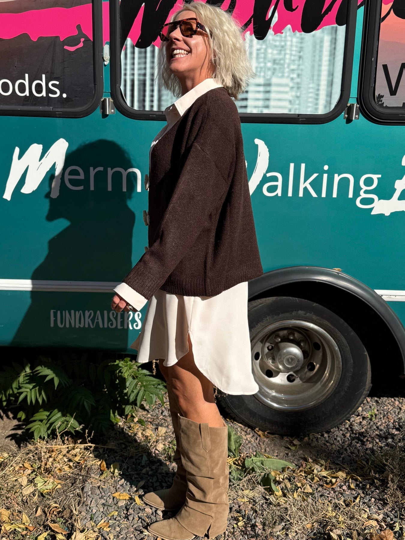 • The Undone It-Girl: Layer it over the It Girl Dress Shirt Dress with tall boots and messy hair for that “effortless but intentional” kind of confidence.