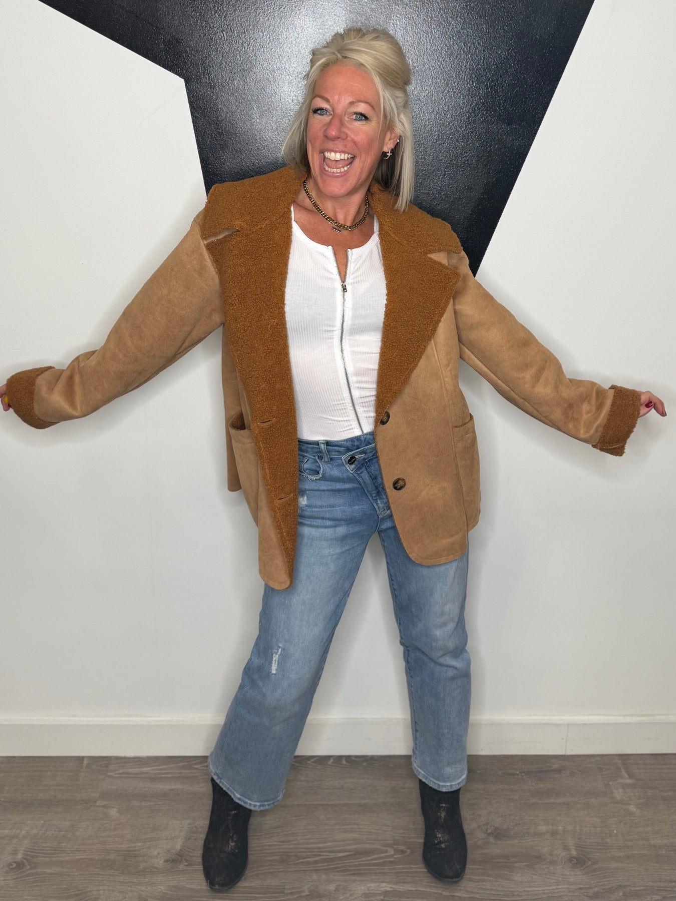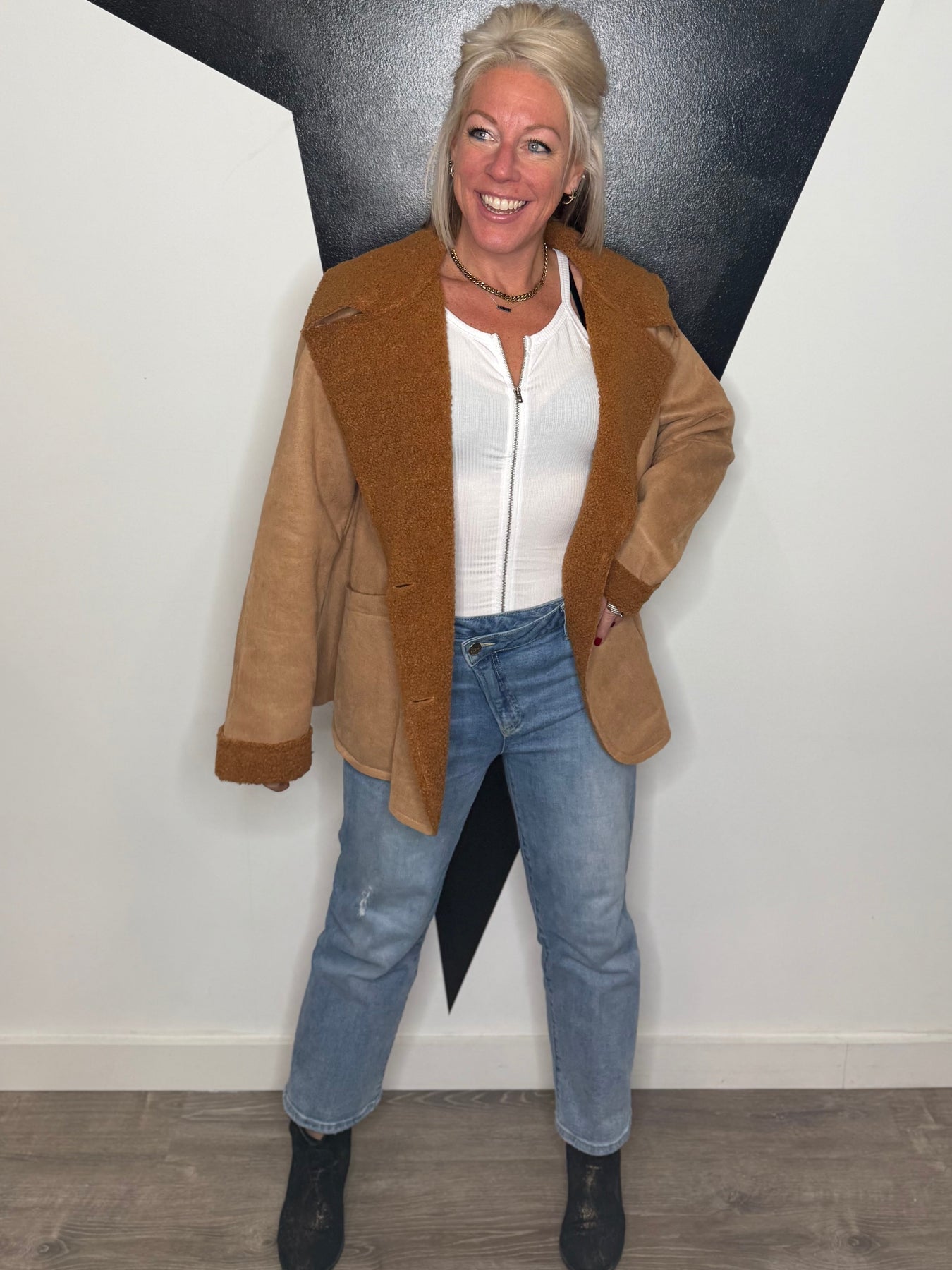 Woman wearing a brown coat and blue jeans standing against a black and white wall.