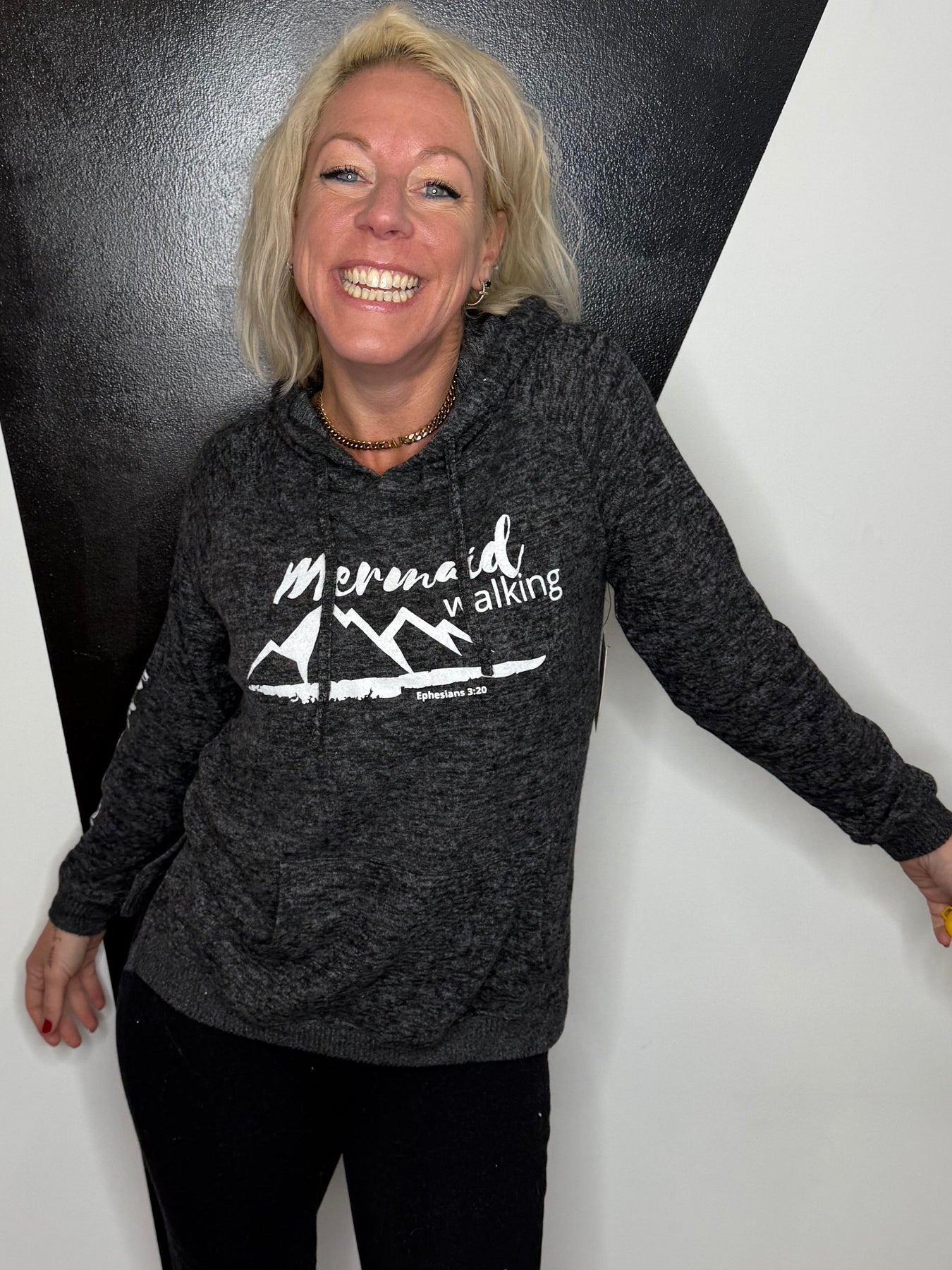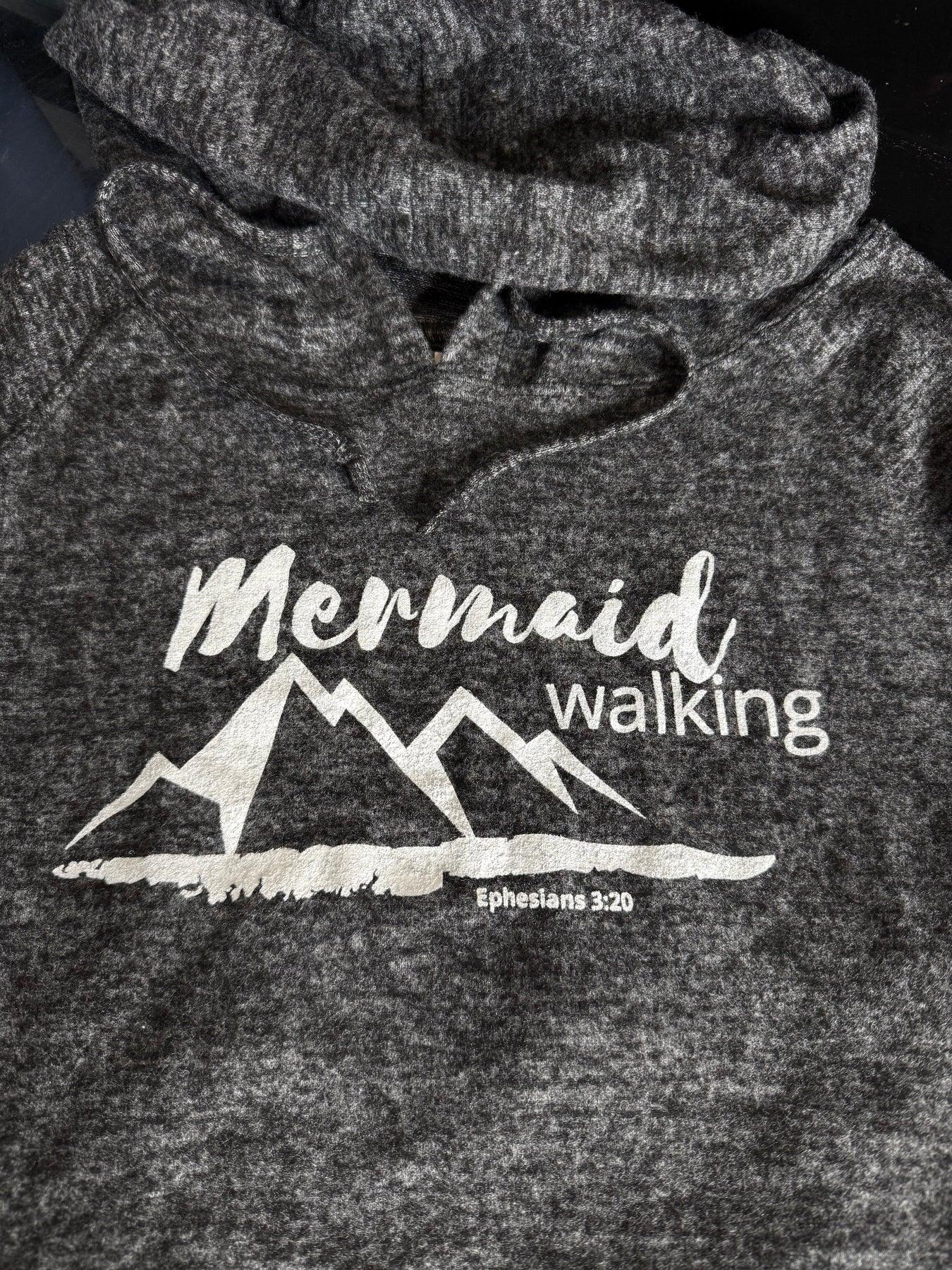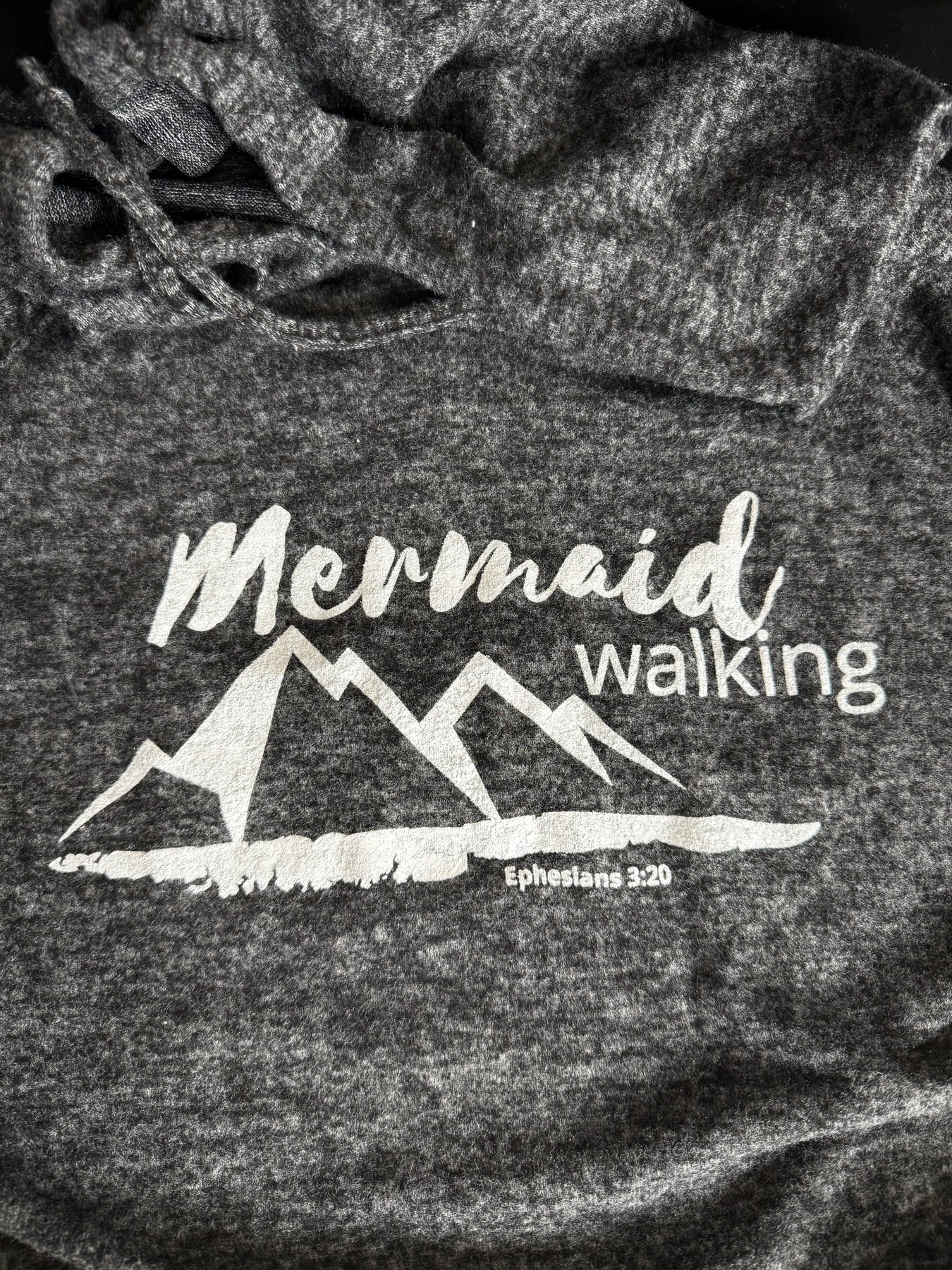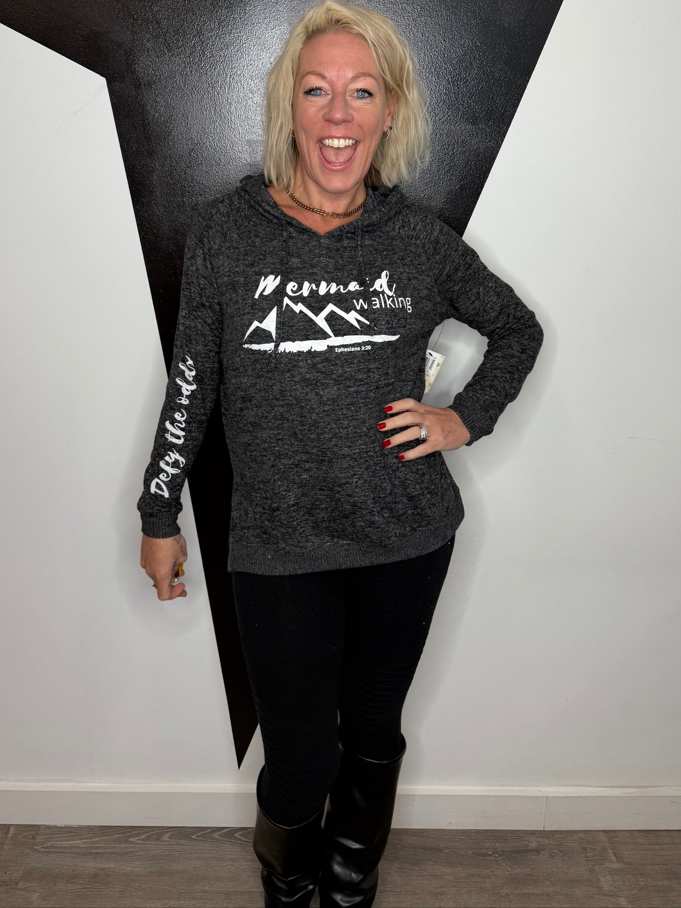Featuring the Mermaid Walking mountain logo across the front and “Defy the Odds” down the sleeve, this piece is more than cozy—it’s a reminder of what you’re capable of. Inspired by Ephesians 3:20, it speaks to the bold belief that the best chapters of your life haven’t been written yet.