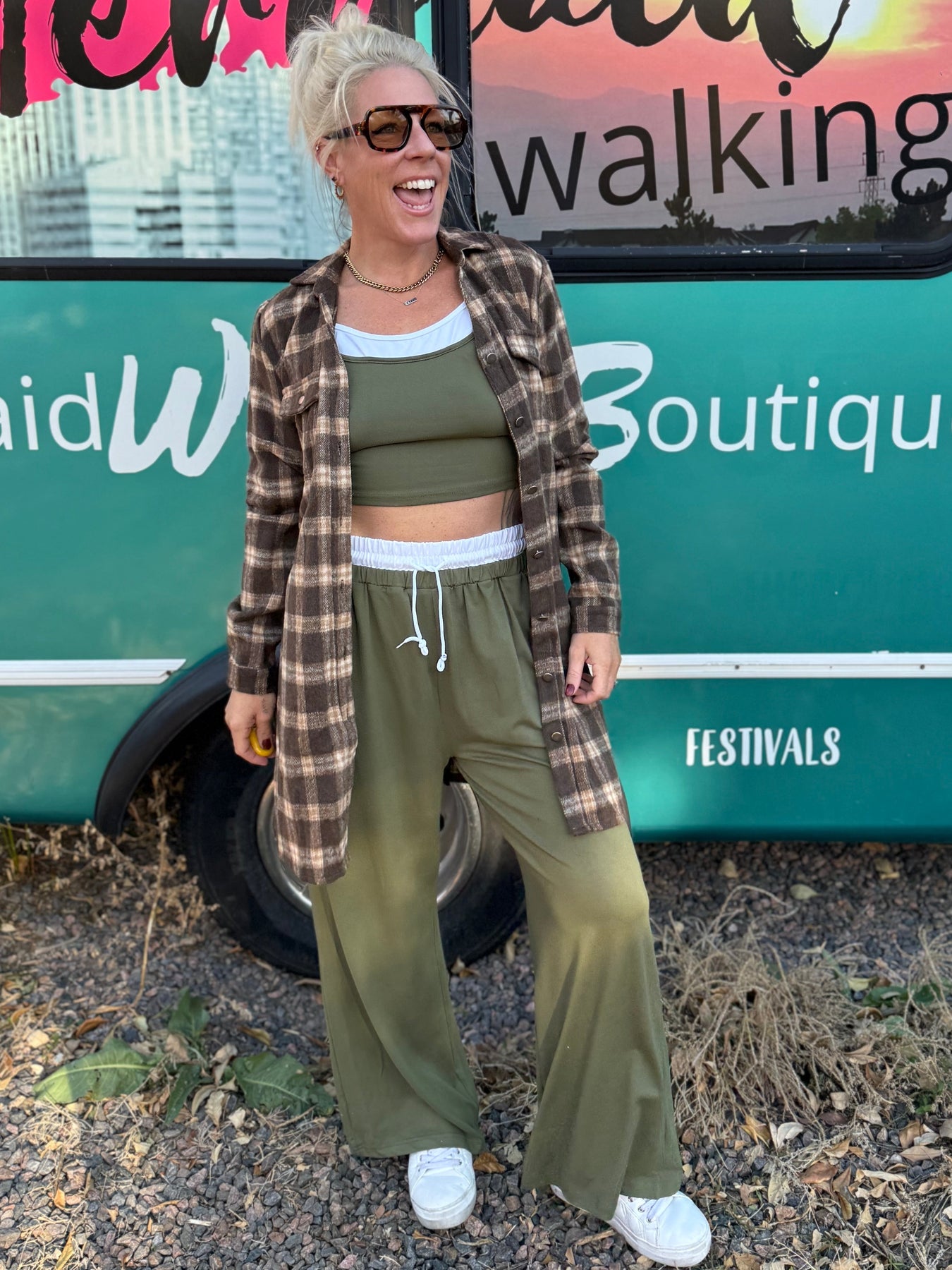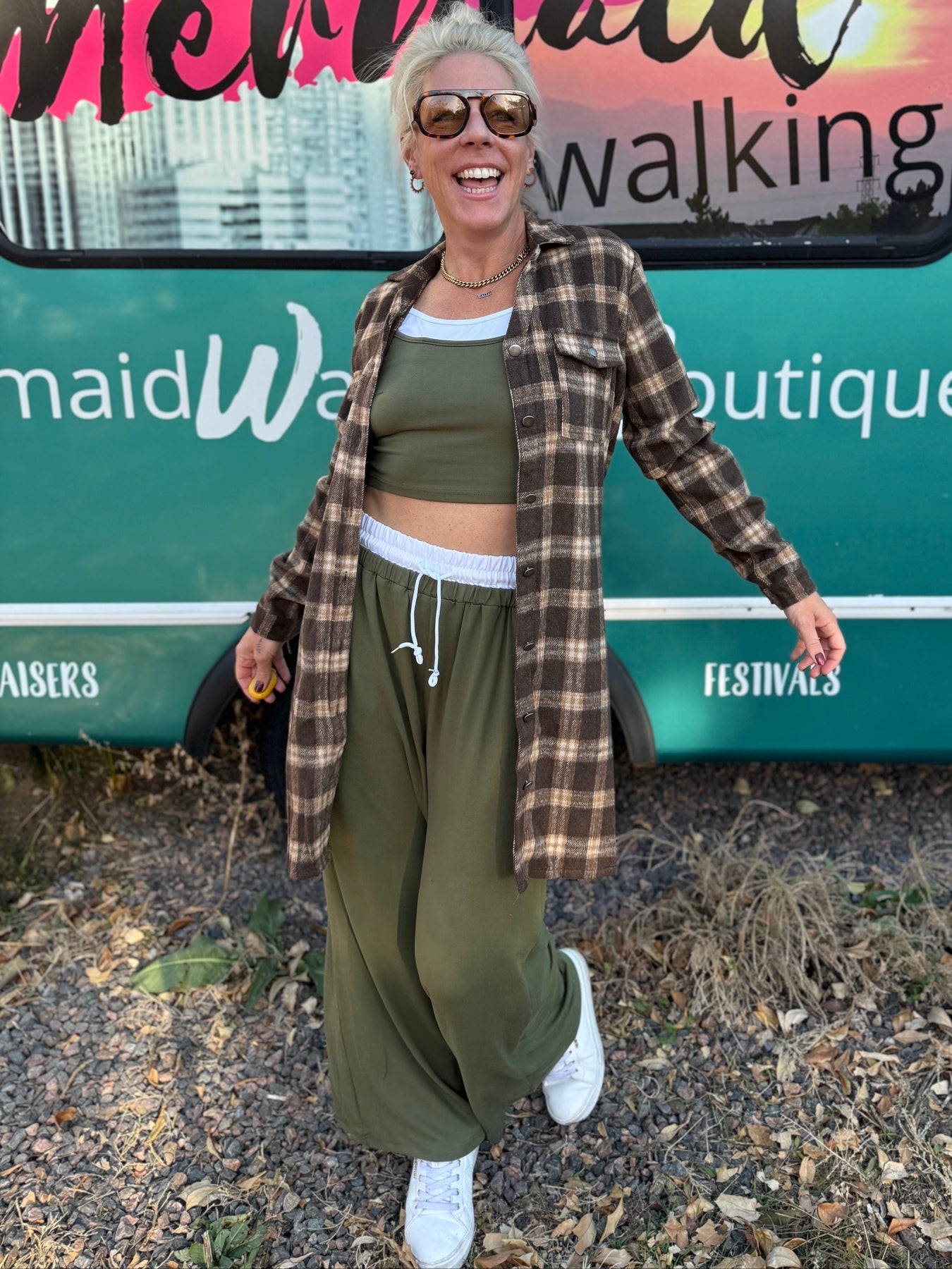 Woman standing in front of a mobile boutique trailer with 'Everyaid Walking' branding.