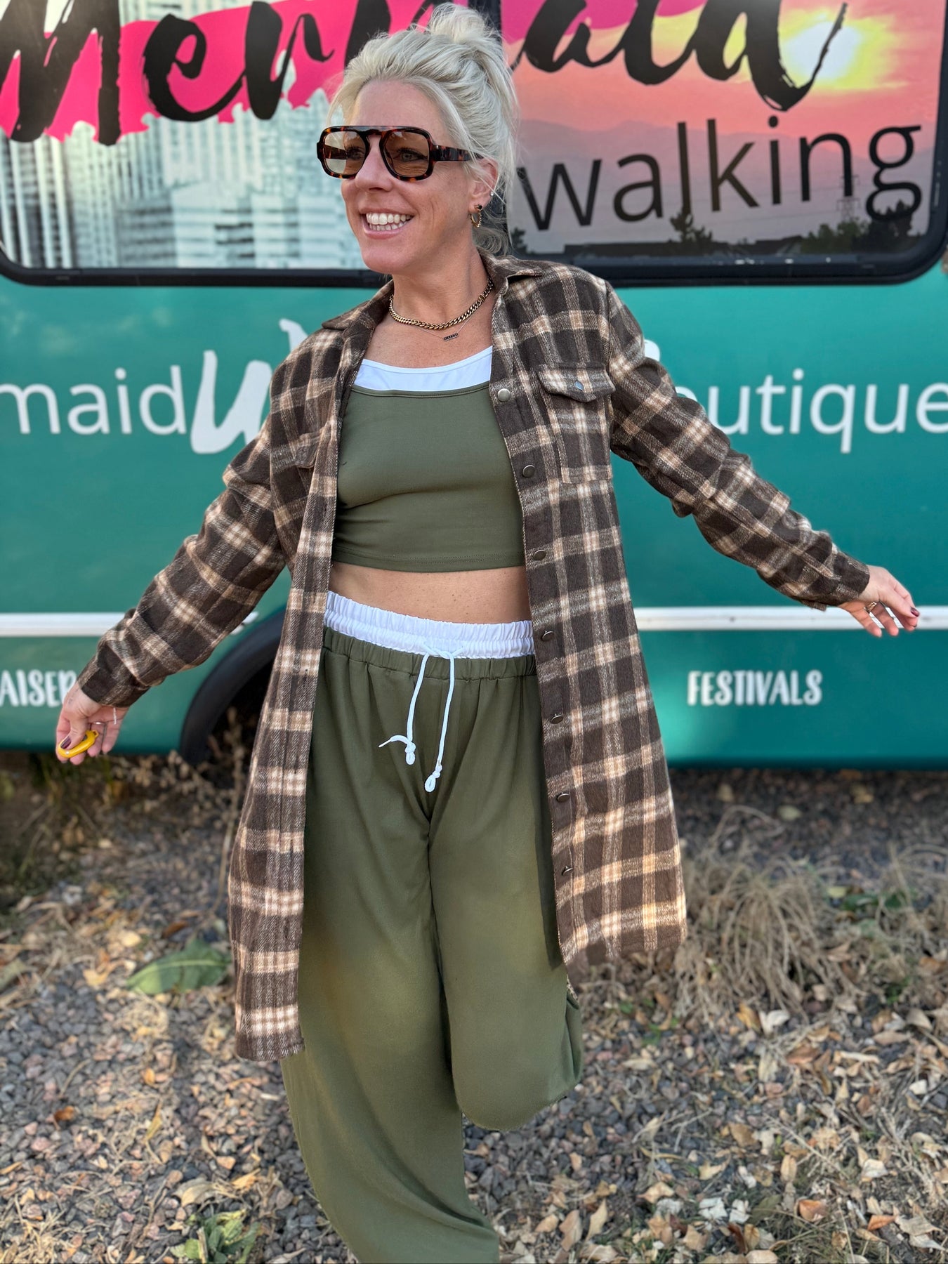 Woman standing in front of a teal mobile boutique truck with 'Mermaid Walking' branding.