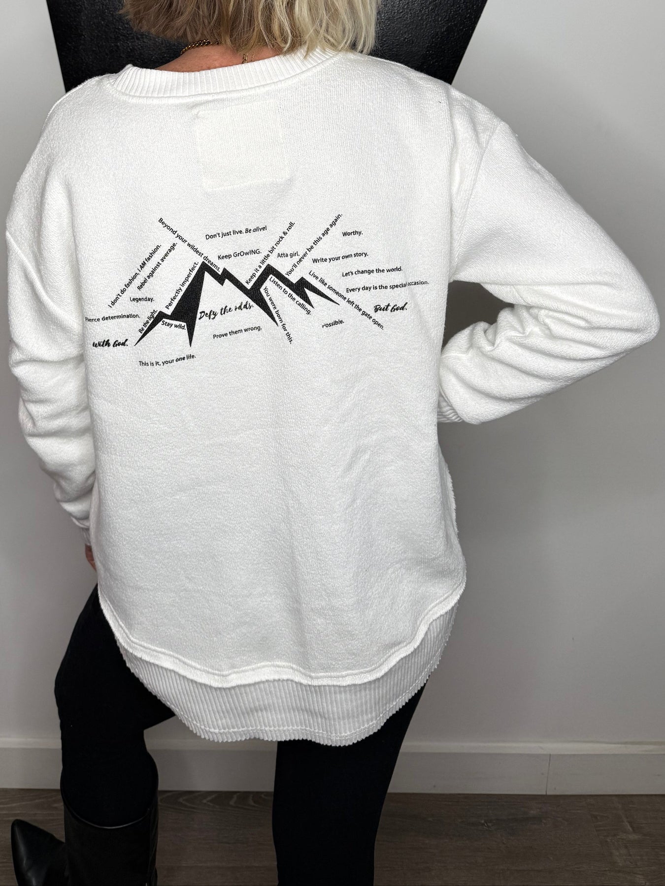 The clean white color feels calm and hopeful, while the mountain graphic on the back is filled with powerful reminders—little truths and encouragements woven into the peaks. Along the sleeve, the words “But what if you fly?” turn a simple sweatshirt into a daily nudge toward courage.
