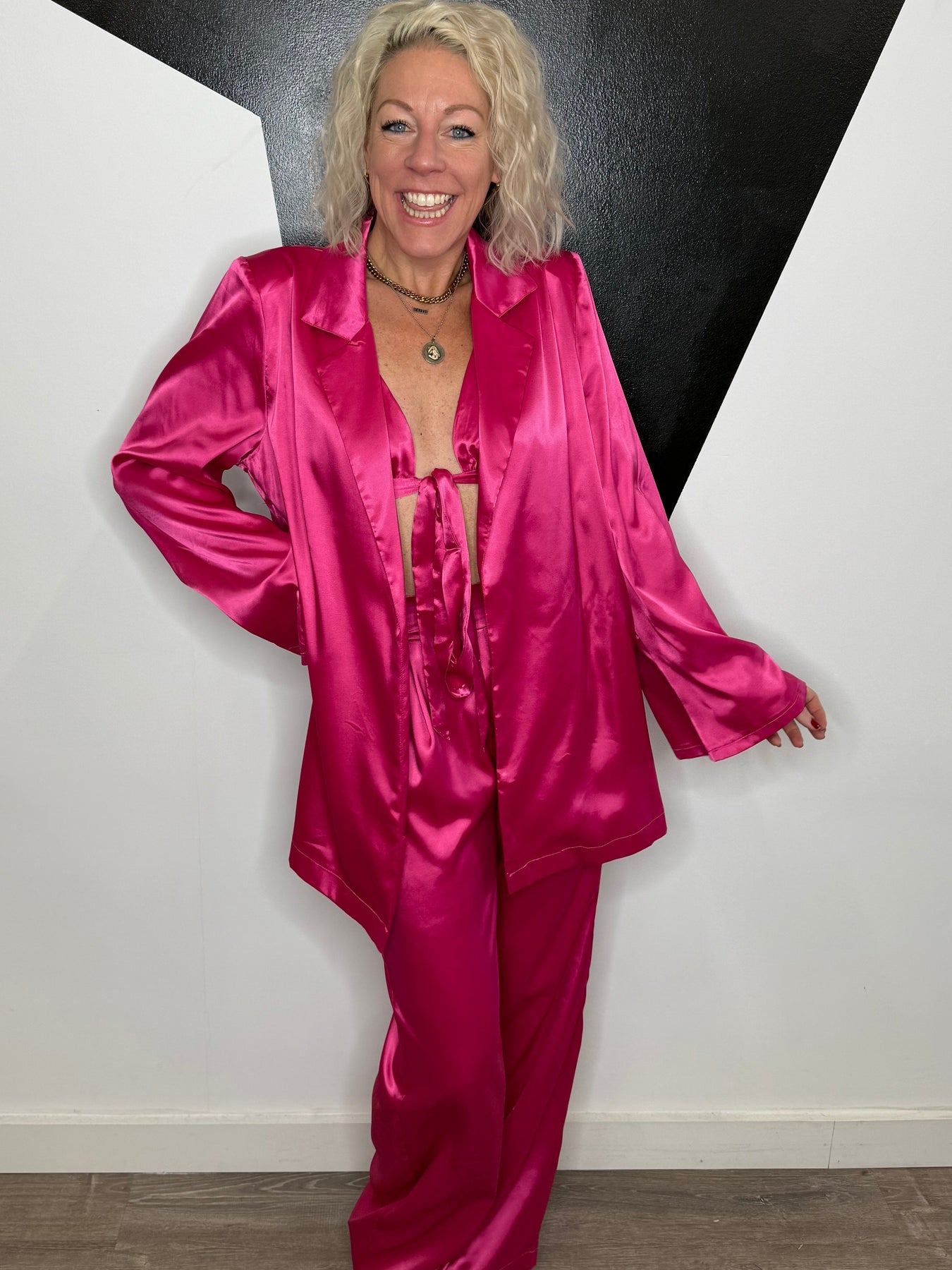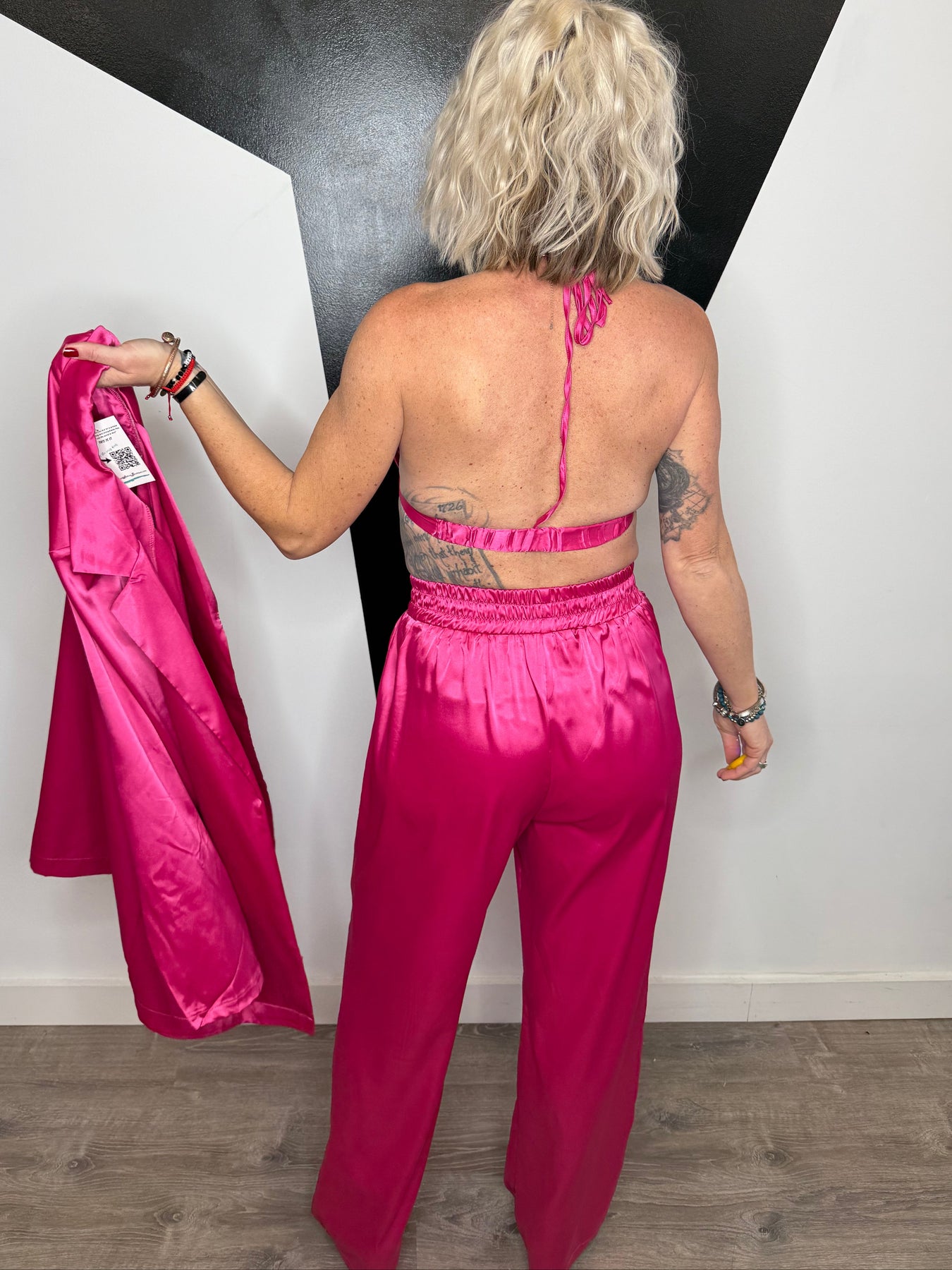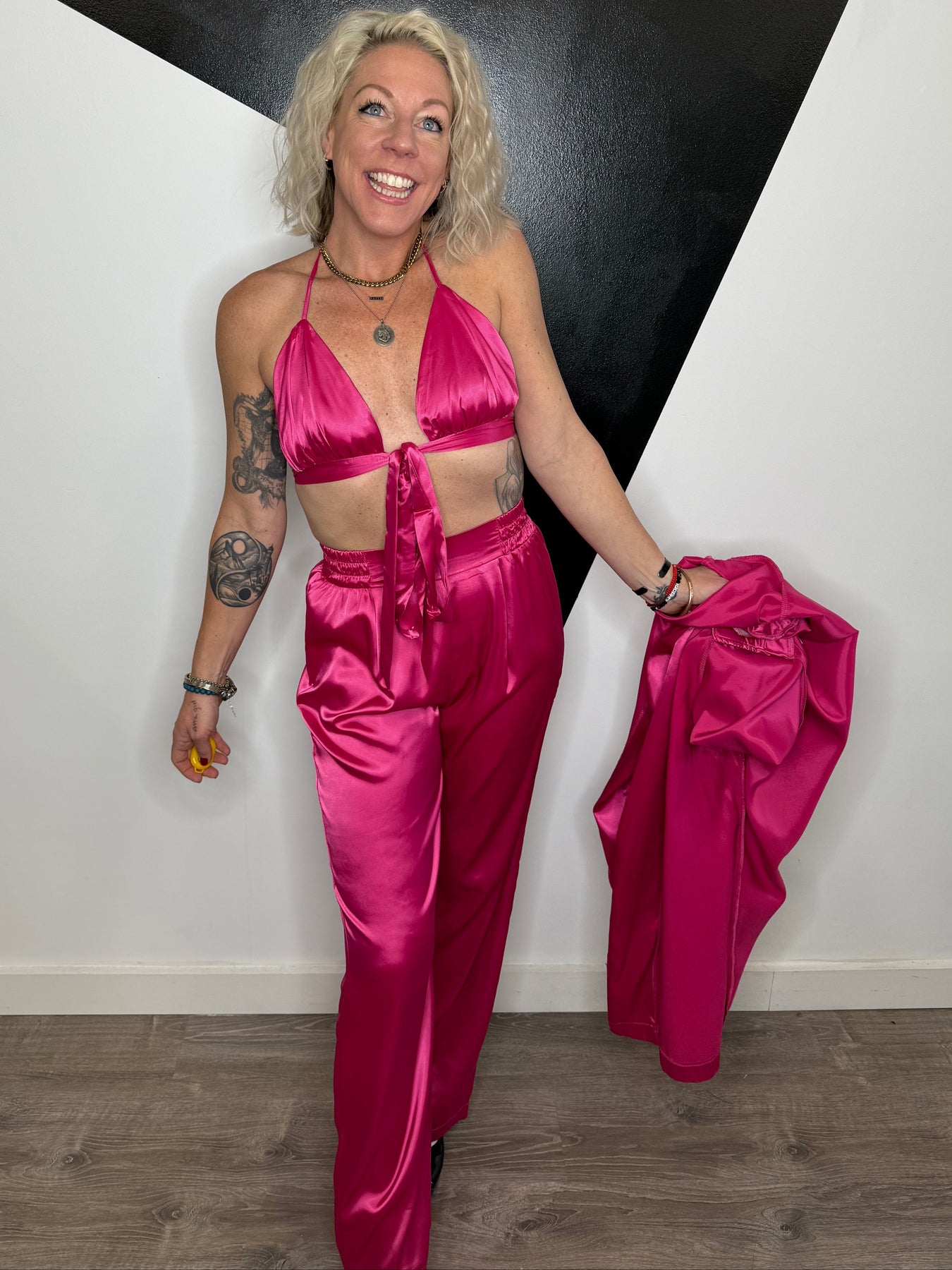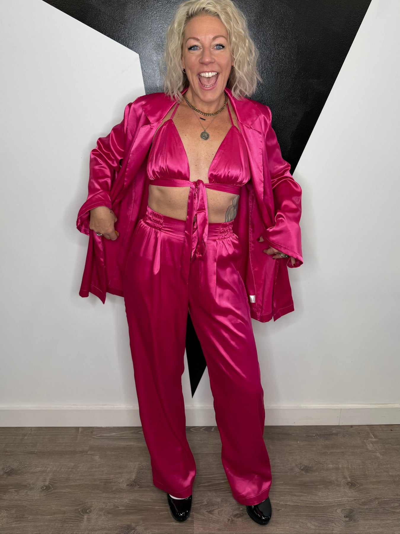 The Three Piece Satin Siren Set is bold, magnetic, and dripping in confidence. Made to move like liquid confidence, this hot-pink satin trio is your permission slip to take up space, feel incredible in your skin, and sprinkle love everywhere you go—starting with yourself.